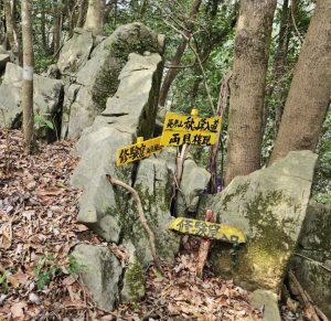 赤牟田ノ辻山頂で昼食後、焼立山から金満尾根を下る。これから進む金満尾根コースには修験道の要素が色濃く残っています。両界宿跡(山伏の行場)、両貝権現、修験窟。修験窟には修行の木札なども観られた。峰入り修行は厳しく過酷を極め、途中で倒れると行中の死を忌み、「石小積」の作法により埋葬されたとも伝えられています。まさに生死を賭けた修行の道をいま私たちは楽しく歩いている。時の流れに不思議な感じがします。