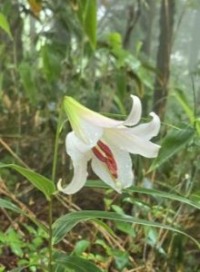 しばらく進むと尾根道に出てここより莇ケ岳まではまだ少しガスにかすむ道でしたが、このあたりでようやく今日の目的のササユリを見ることができました。まだ少し花には早く蕾の状態でしたが清楚な姿を見せてくれました。