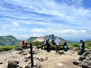 さあ、本日の難関の三俣山南峰直登コースへ出発。約2時間の登りだが、途中には岩場があったりして、心地よい風で涼みながら、坊がつるや大船山を眺めつつ登るこのルートが私は大好きだ。それにしても気温が高すぎる。暑過ぎたため、熱中症に注意しながら、標高100㍍登る毎に水分補給の休憩をとって進む。南峰に登頂した時には皆の疲れた顔も満面の笑顔に変わり、ハイタッチ。私はこの瞬間がたまらない。