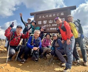 8時15分出発。登山道は急登ではあるが階段で整備されているところが多く、45分程で小文字山山頂に到着(9:00)。北九州には夏の風物詩として「小文字焼」というお盆に行われる行事がある。そのお祭りの中で迎え火として「小」の火文字が現れるが、その火文字は小文字山山頂にて行われている。そして再び足をすすめ、妙見山を経由して足立山に到着(10:40)。軽食をとりながら、今日の目的地である戸ノ上山までの険しい道のりを目の当たりにし、再び気合を入れ直し出発。アップダウンの繰り返しをなんとか耐え抜き、昼食の予定地であった大台ヶ原に到着(13:20)。大台ヶ原は、美しい緑の平地が広がる開放的な場所である。北九州市をパノラマ的に堪能することができるため、初日の出には毎年多くの人が訪れる。昼食時には風が強くとても寒さを感じた。その際に森本さんからいただいたおしるこがとてもおいしく、今までの疲れを癒してくれたことが記憶に残っている。昼食を済ませ、戸ノ上山へ出発(13:50)。景色の良い登山道をすすむと徐々に足元が悪くなるが、登りつめると戸ノ上山山頂に到着(14:20)。山頂からの関門海峡、巌流島、彦島方面の景色は絶景。山頂にある戸上神社にて山行の無事を祈り、バスの時間に合わせて下山を開始。約430㍍の標高差を1時間で下山する急勾配であり、疲労が溜まった足ではあったがなんとか寺内バス停に到着し、一日の山行を無事に終えた(16:20)。