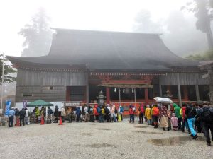 令和7年5月25日に夏山シーズンの到来を告げる山開きの神事が、雨天の中、英彦山(1199㍍)の中腹にある英彦山神宮奉幣殿で行われました。午前11時、太鼓の音が神事の始まりを告げました。宮司による登山者の安全祈願の祝詞に続いて、地元の観光関係者や警察官など来賓による玉串奉奠が行われました。その後に登山者を代表して日本山岳会北九州支部副支部長が玉串奉奠を行い、奉幣殿の前に参列した登山者とともに柏手を打ちました。神事の終わりに、宮司が法螺貝を吹いて邪気を除いました。神事の終了後には参列者一人ひとりに添田町観光連盟より山開き記念の手ぬぐいが配られました。また、地元警察はチラシを配り、登山者の安全登山、遭難事故防止を呼び掛けました。