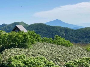 27日28日と最初に登る予定の羅臼岳は天気が悪く、小清水原生花園や網走監獄、羅臼、野付半島を観光しました。29日はやっと晴れて斜里岳に登ります。清岳荘登山口から出発し、15分程歩くと沢沿いの道になり何度も渡渉しながら進みますが、だんだん水量も多くなり、じわじわと難度も増してきます。1時間程で旧道(沢コース)と新道(尾根コ-ス)の分岐が有り、景色の良い尾根コ-スを選択。熊見峠からは摩周湖が見えて気持ちの良いハイマツ帯の中を進み、上二股からは胸突き八丁と言われるガレ場を通り、やっと馬の背に着いて頂上を見上げた時は急登で最後の登りに気合を入れ直し、あと30分の頂上を目指しました。頂上からはオホ-ツク海、その手前には斜里町の畑がパッチワークのようにきれいに見えます。そして遠くに羅臼岳・・・太平洋側は国後島も見え大パノラマの素晴らしい眺望でした。