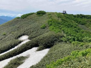 小屋前のベンチでブユを追い払いながら20分ほど休憩し山頂を後にした。大峰分岐からは日本海を見ながらしばらくの下り。天気も良く、ニッコウキスゲやイブキトラノオの花が点々と草地から頭を出していた。