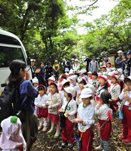 北九州支部から9人がサポートする。9時30分駐車場に集合して、園児の到着を今か今かと待つ。有志ボランティアの保護者の方が到着し始め、その後赤い帽子の年少さんを乗せたバスも到着する。