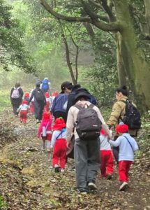 コロナ渦後、さいわい幼稚園のハイキングが再開され、昨年に続き2度目である。前日に雨が降り、心配されたが幼稚園の先生が早朝に登山道を偵察され実施のサインがでる。
